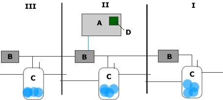 Dans chaque compartiment (désignés par les chiffres romains), il y a une bouteille de 200 l de fréon ( c ) et chaque bouteille a 3 sorties contrôlées par des vannes électromagnétiques. Une sortie mène au compartiment où est située la bouteille et les 2 autres vers les compartiments voisins. De cette manière, le 2è compartiment peut être alimenté en fréon par les bouteilles des 3 compartiments, ce qui est arrivé dans ce cas (selon des témoins, la concentration de fréon était tellement forte que des gouttelettes se formaient sur les murs et le matériel !).