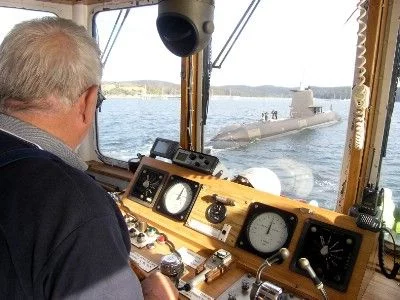 Le capitaine Daryl Sherlock manoeuvre son remorqueur pour assister le sous-marin lors de son accostage.