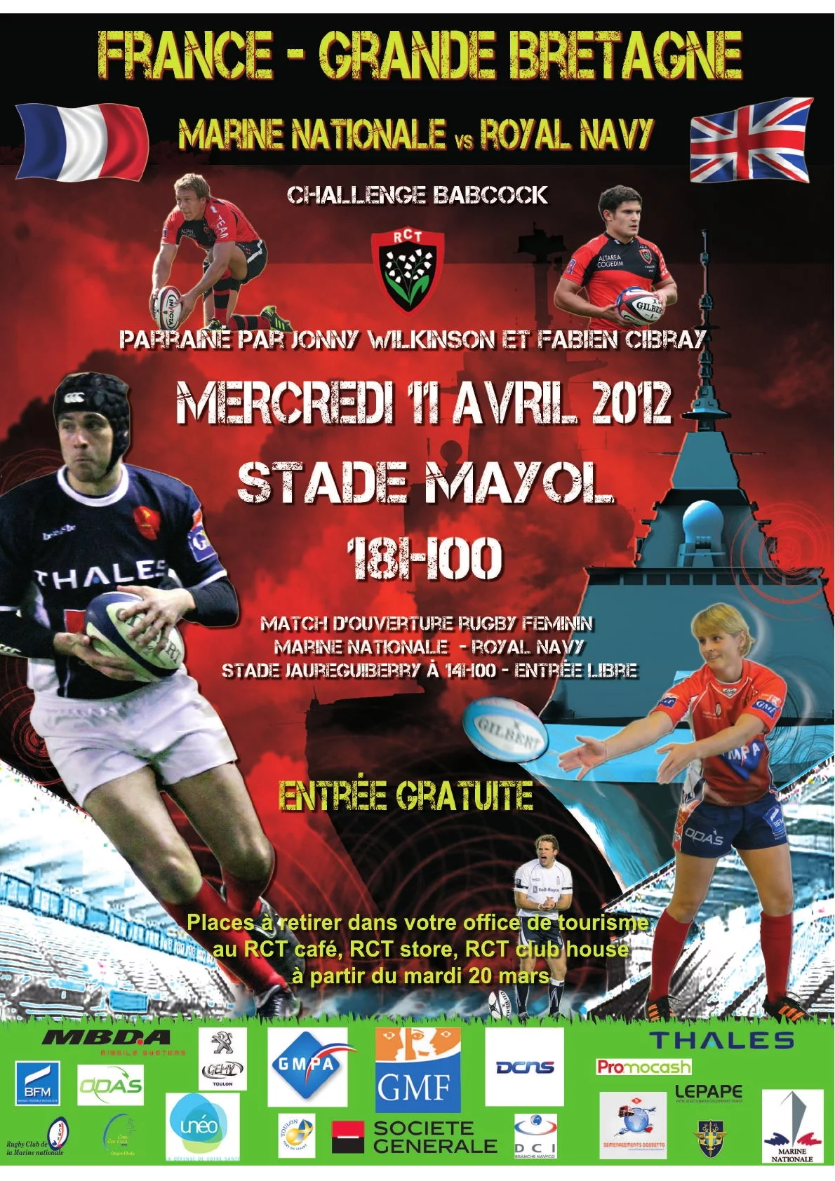 Mercredi 11 avril 2012, à 18h00, se déroulera au stade Mayol le match « FRANCE-GRANDE-BRETAGNE » MARINE, opposant le Rugby Club Marine Nationale (RCMN) à la Royal Navy Rugby Union.