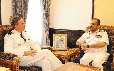 Le contre-amiral Abdullah bin Khamis al-Ra’eesi, commandant de la marine royale d’Oman, a reçu dans ses bureaux de Mu’askar Al Murtafa l’amiral Antoine Busan, commandant des forces navales françaises basées en océan Indien, qui visite actuellement le Sultanat.