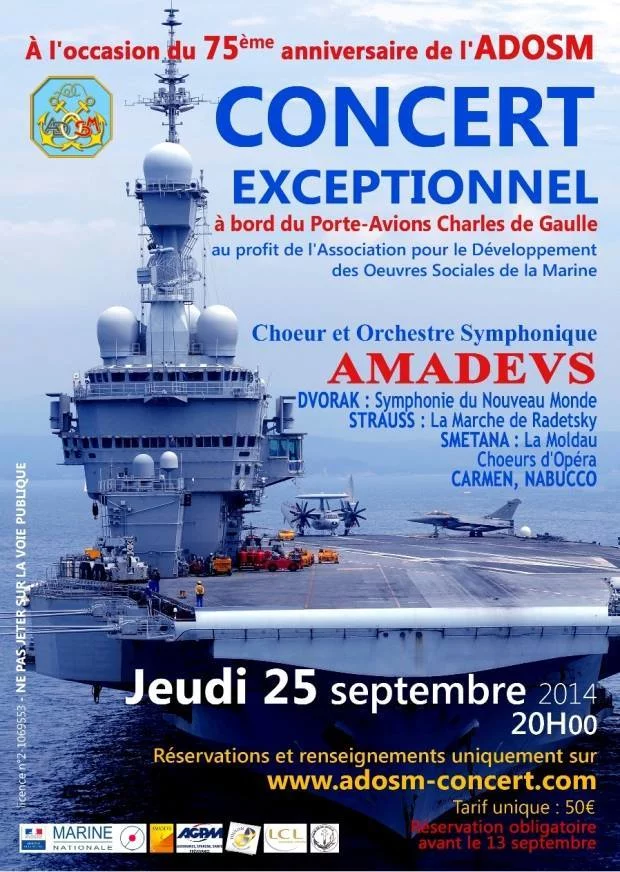 L’ADOSM fêtera son 75e anniversaire en musique ! Concert exceptionnel et grand public à bord du porte-avions Charles de Gaulle par le Chœur et orchestre symphonique AMADEVS, au profit de l’Association pour le développement des œuvres sociales de la Marine.