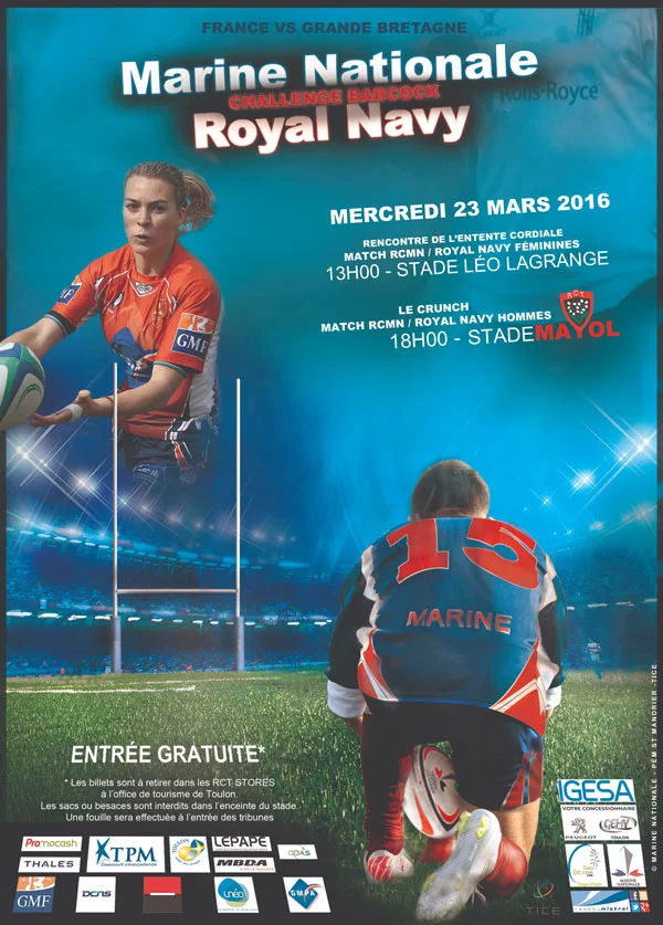 Mercredi 23 mars 2016, à 18h00, Toulon accueillera à nouveau les rencontres annuelles de Rugby entre les équipes de la Royal Navy et de la Marine Nationale au Stade Mayol.