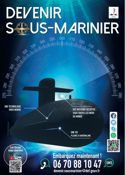 Pour plus d’informations : devenir.sousmarinier@def.gouv.fr ou par téléphone : 06 70 88 10 47. Ainsi que sur les réseaux sociaux Twitter, Facebook et avec le hashtag #devenirsousmarinier.