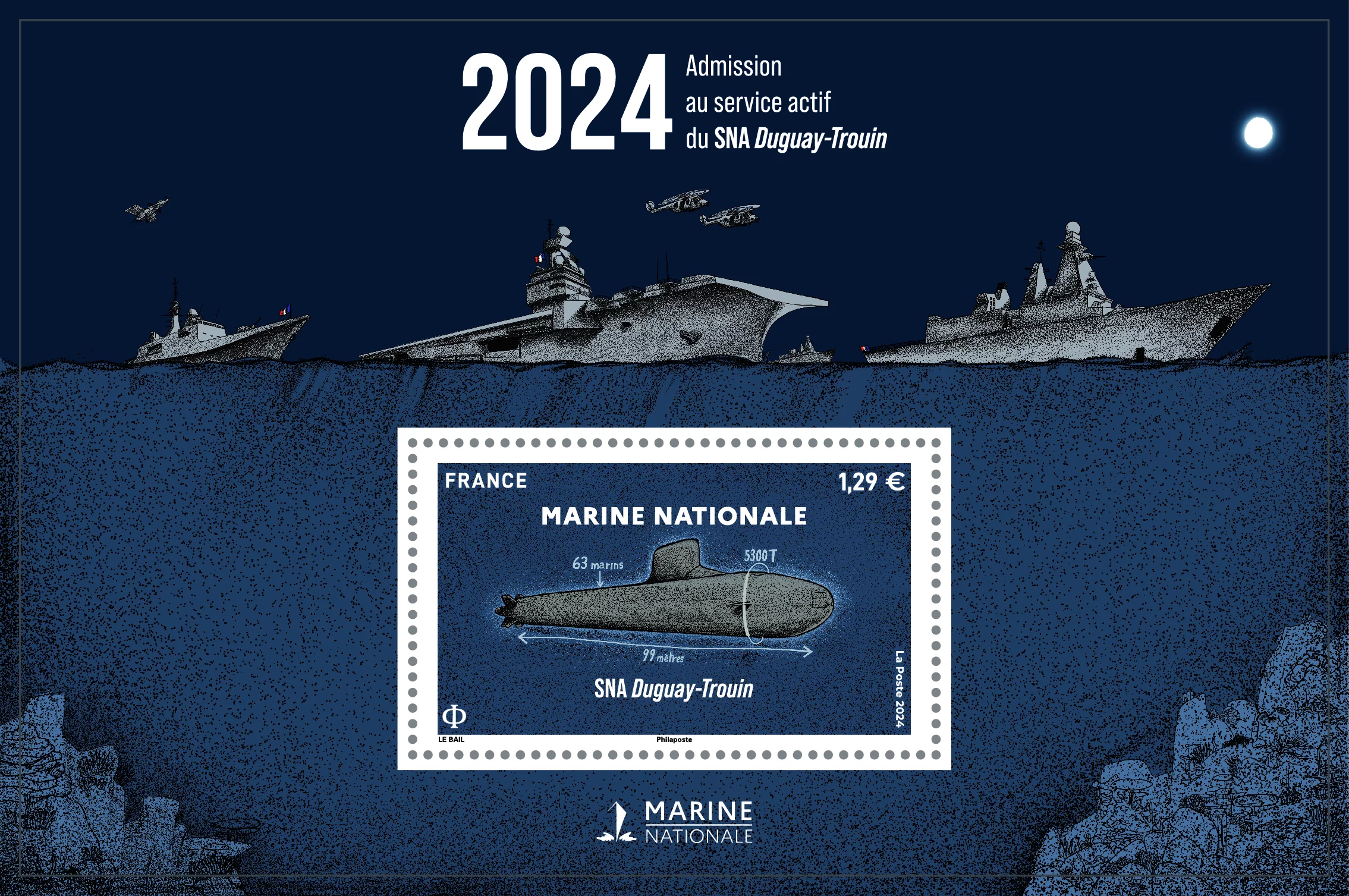À peine livré, le sous-marin nucléaire d’attaque (SNA) de nouvelle génération Duguay-Trouin se fait déjà une place dans les classeurs des philatélistes. Le troisième SNA de la classe Suffren aurait en effet droit à un timbre à son image, indiquent La Poste et la Marine nationale. Il sera émis au prix de 1,29 euros dans un bloc le 12 novembre 2024 ; et en avant-première du 7 au 9 novembre dans certains lieux.