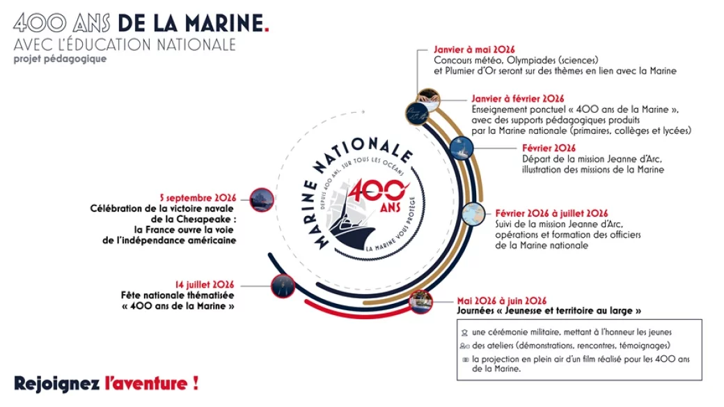 En 2026, la Marine nationale célèbre ses 400 ans. Dans la continuité de l’« année de la mer », cet anniversaire est l’occasion de mettre en valeur au cours de l’année scolaire 2025-2026 les liens qui unissent la France à la mer et de partager dans les écoles et les établissements scolaires les valeurs universelles qu’elle porte : celles de l’ouverture à l’autre et au monde, du dépassement de soi, de l’esprit collectif qui s’incarne dans l’esprit d’équipage.