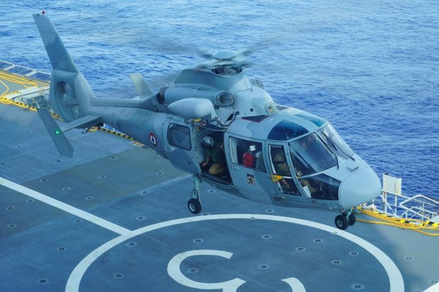 Le groupe Jeanne d’Arc a été déployé jusqu’en zone sud de l’océan indien pour y mener une séquence de coopération importante. Le 29 mars, un hélicoptère Dauphin a été engagé lors d’une évacuation en mer au large de la Réunion. Contacté par le CROSS Réunion pour porter secours à un marin à bord du navire URANUS 1, l’équipage d’alerte a décollé du porte-hélicoptère amphibie Dixmude avec à son bord un médecin.