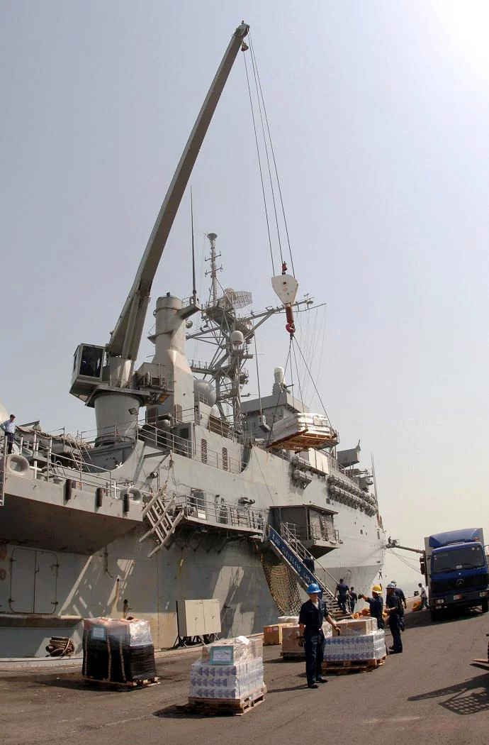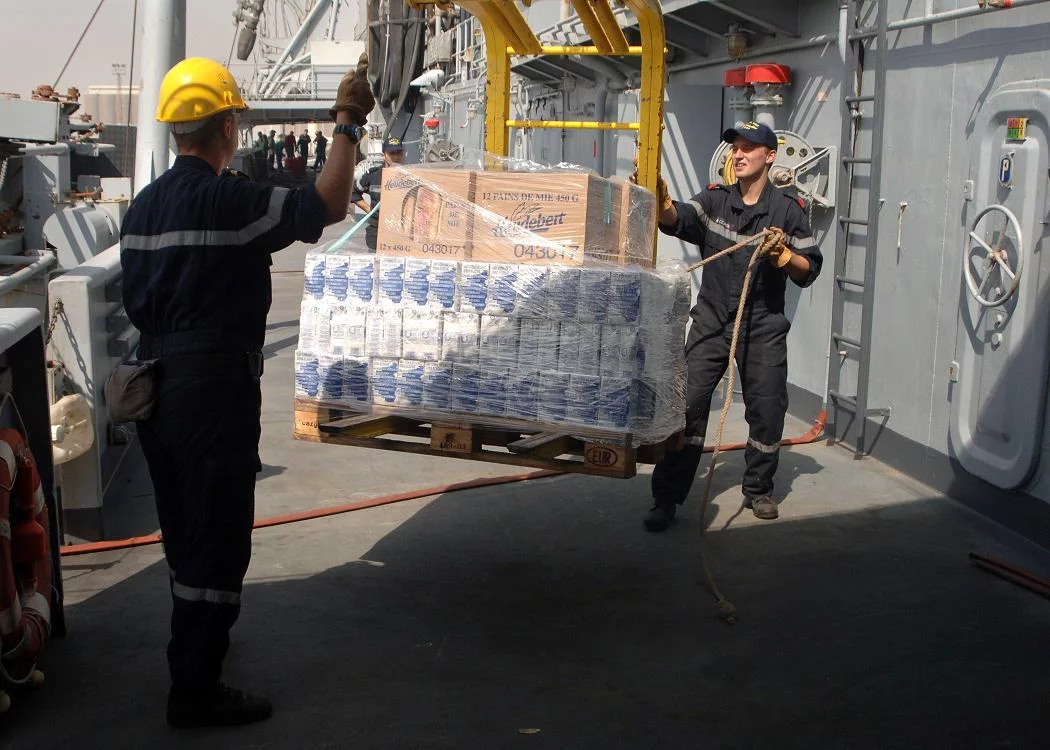 Débarquée du Var, la nourriture a été chargée sur l’USS Cleveland pour être transportée vers le Pakistan. Les 2 navires se sont arrêtés sur l’île-état de Bahreïn pour une brève escale, qui a rendu possible le transfert entre les 2 navires.