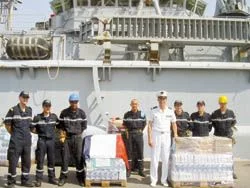 “La nourriture faisait partie de notre cargaison”, a déclaré le Cdt Poisot. “Mais après le tremblement de terre au Pakistan, nous avons demandé à nos supérieurs en France si nous pouvions envoyer certaines des palettes de la cargaison au Pakistan pour aider ceux qui en ont besoin.”
