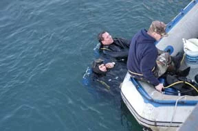 Un bateau goflable emmène les plongeurs à différents endroits pour vérifier la position du navire. Photo : U.S. Navy (JOSN Joseph Caballero)