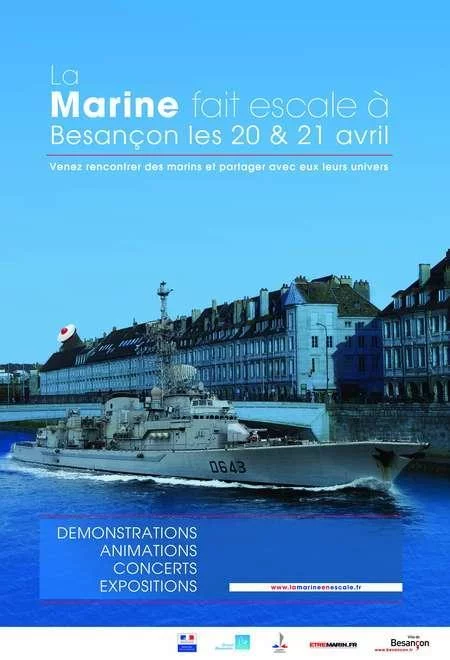 La Marine fera escale les 20 et 21 avril 2013 dans la ville de Besançon. Cet événement sera l’occasion, dans une région éloignée de la mer, de rappeler et de faire découvrir aux bisontins le rôle, l’action et les métiers de leur marine, de les transporter dans l’univers des navires, des sous-marins et des aéronefs français, de les faire voyager à travers le monde et participer aux missions des équipages de la Marine nationale.