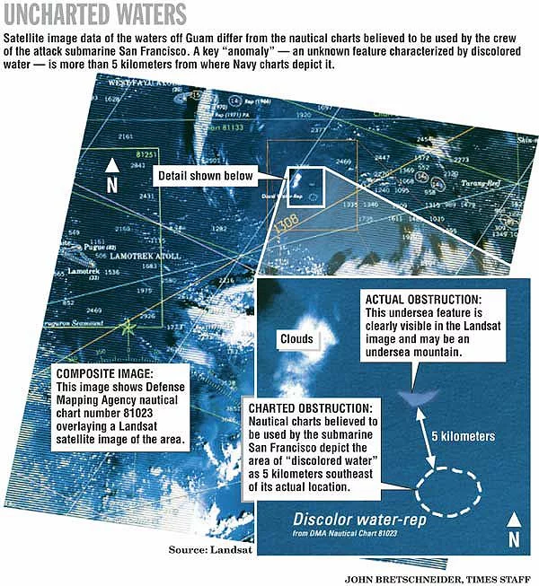 Des responsables de la Défense ont déclaré que la montagne, qui monte à quelques 30 mètres sous la surface, n’apparaît pas sur les cartes que la Navy utilise. Un marin est mort et plus de 60 autres ont été blessés lorsque le sous-marin, le San Francisco, a heurté violement la montagne, ou un récit submergé, à grande vitesse le 8 janvier.