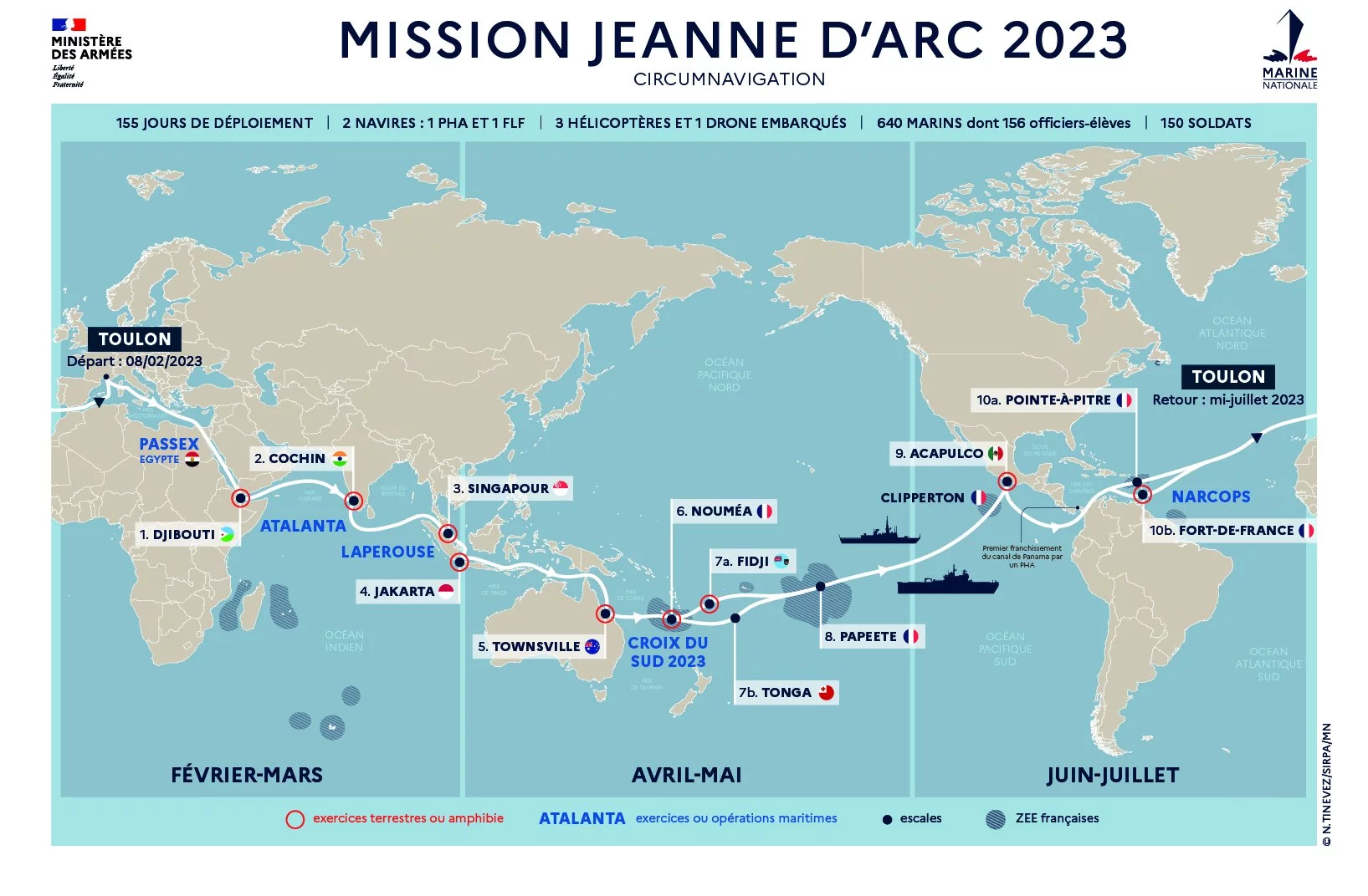 La mission Jeanne d’Arc de la Marine nationale, qui appareillera de Toulon le 8 février, réalisera un tour du monde complet, durant 155 jours. Cela n’était pas arrivé depuis 2001 avec la campagne de l’ex-porte-hélicoptères Jeanne d’Arc.