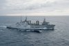 Le bâtiment ravitailleur (BRF) des forces Jacques Stosskopf effectue un ravitaillement à la mer avec la frégate de surveillance Germinal