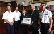 De gauche à droite : Le capitaine Dominique Hautot, l’officier en second Sébastien Thabuis, le consul honoraire français Odile Blanchette, le baillis Geoffrey Rowland et le capitaine Stéphane Sxay. (Photo par Brian Green)